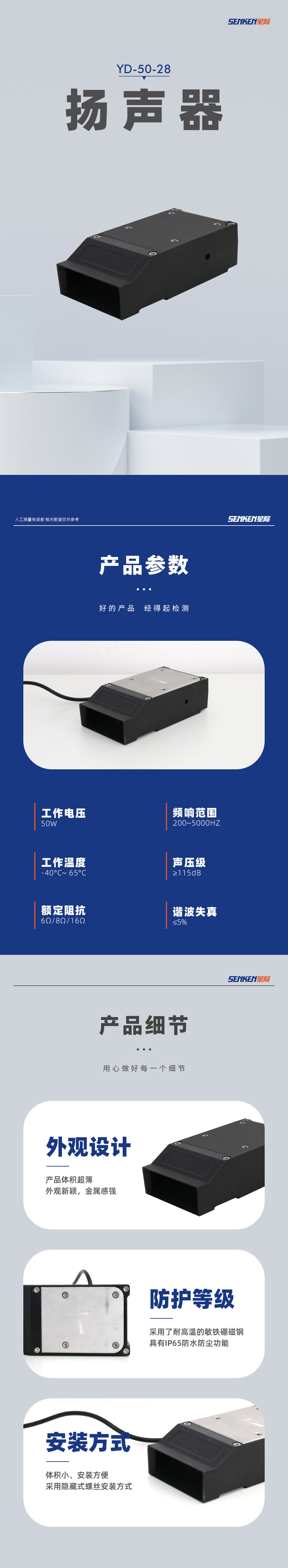 YD-50-28扬声器是我司采用国际先进的技术工艺,专为各式电子警报器、报警器装置而设计的超薄新产品。它采用了耐高温的钦铁硼磁钢,内磁结构,加注进口磁流体,具有外观新颖小巧、音质清晰、防水、耐腐蚀、密封性好等优点,各项电声参数均达到国内同类产品领先水平,被广泛应用于特种车辆及固定场所作警报配套使用。