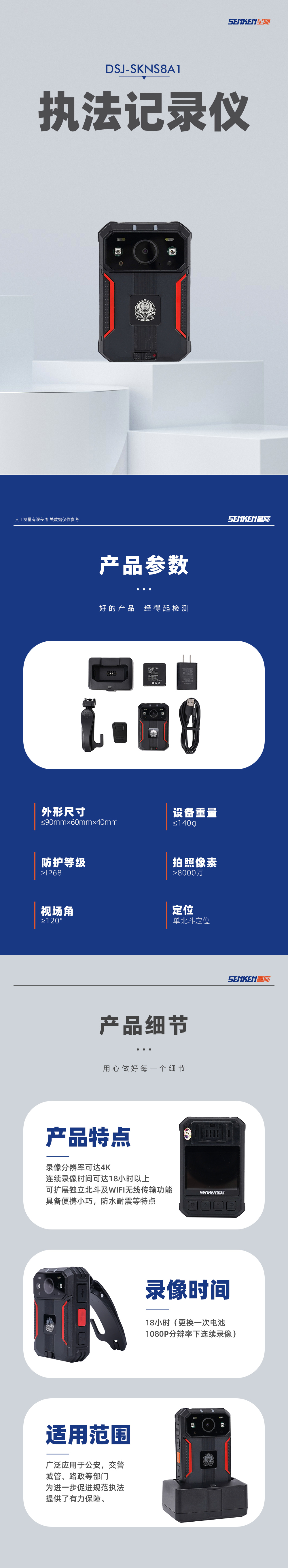 S8 执法记录仪是集录像、拍照、录音为一体的高科技现场执法影音记录装备。录像分辨率可达4K,连续录像时间可达18小时以上,可扩展独立北斗及WIFI无线传输功能,具备便携小巧,防水耐震等特点。广泛应用于公安,交警,城管、路政等部门,为进一步促进规范执法提供了有力保障。