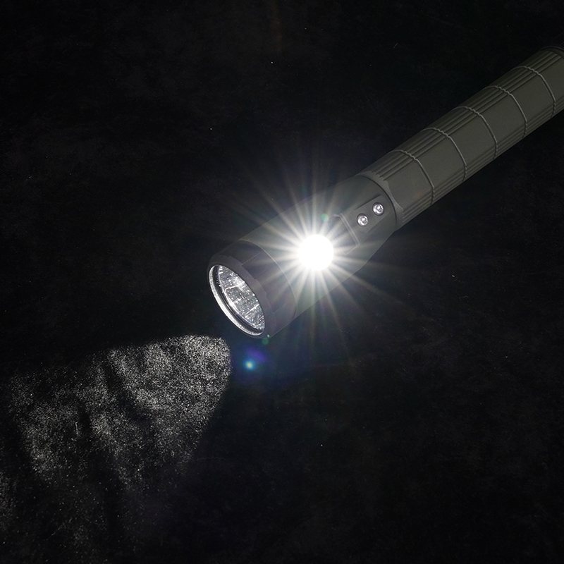 • 远距离照射:头部采用带有光学弧度的铝合金镀铬光杯,适合远距离照射,同时具有亮度选择和视线扰乱爆闪功能;
