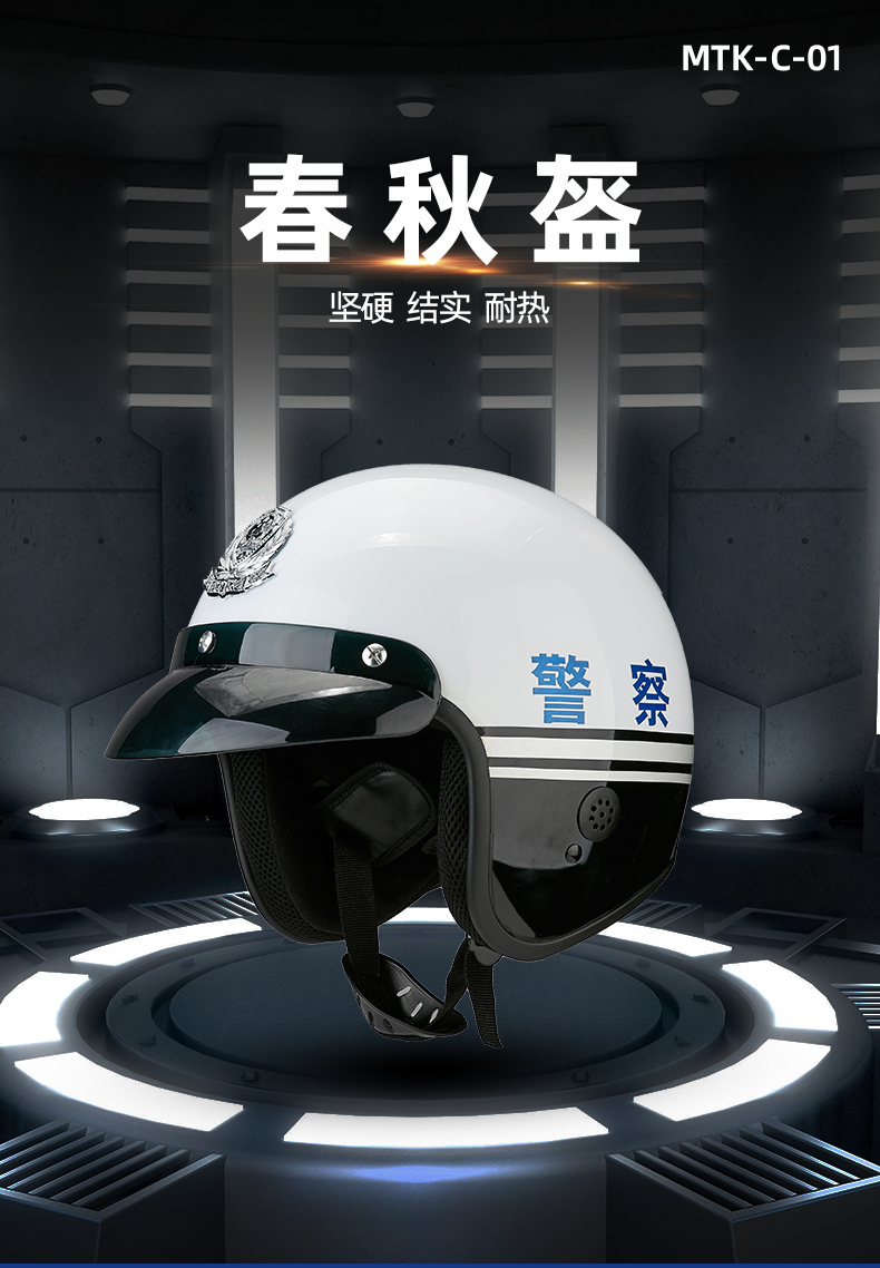 MTK-C-01警用摩托车头盔(春秋盔)是一种用于防止头部及面部受到打击或其他潜在的伤害性攻击的警用装具。本头盔采用高强度ABS和PC材料制造,头盔由壳体、缓冲层、佩戴装置等组成,具有线条流畅,视野宽阔,透光率好,佩戴牢靠、舒适、解脱方便等特点,符合《GA295-2001警用摩托车头盔》标准的规定。是警务人员在日常执勤巡逻中保障自身的必备防护装备。